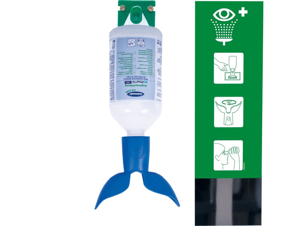 Stanice na vyplachování očí s jednou lahvičkou a držákem na stěnu. Sterilní lahvičky TWIN připravené k použití s ergonomickým uzávěrem pro současné vyplachování obou očí. Piktogramový návod se zrcátkem pro snadnou manipulaci. s 500 ml roztoku fosfátového pufru BioPhos®74. Doba oplachování: cca. 2,5 minuty. Doba použitelnosti: 3 roky.