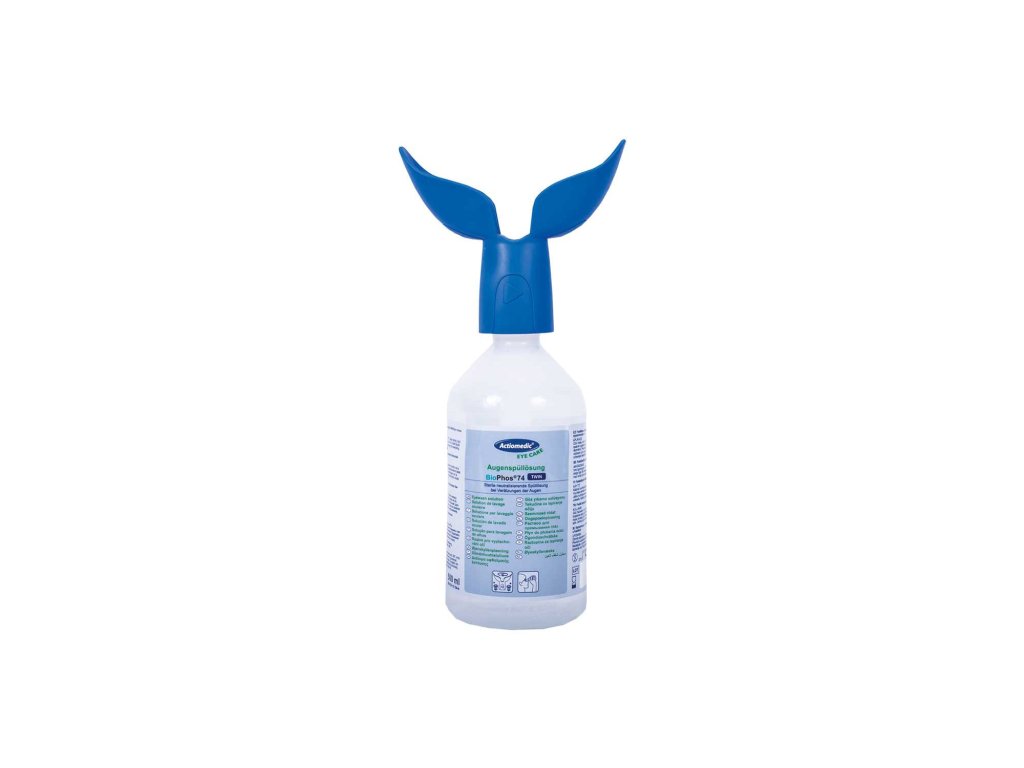 Sterilní lahvička na výplach očí s 4,9% roztokem fosfátového pufru, pro poranění očí způsobená chemikáliemi (kyseliny a zásady), s vysokou pufrovací kapacitou, zvláště šetrná díky nedostatku umělých přísad a konzervačních látek. S ergonomickou irigační hlavou TWIN pro současné vyplachování obou očí. Odpovídá DIN EN 15 154-4. Pro mobilní použití nebo pro nabíjecí stanice a držáky. Doba oplachování: cca. 2,5 minuty. Doba použitelnosti: 3 roky.