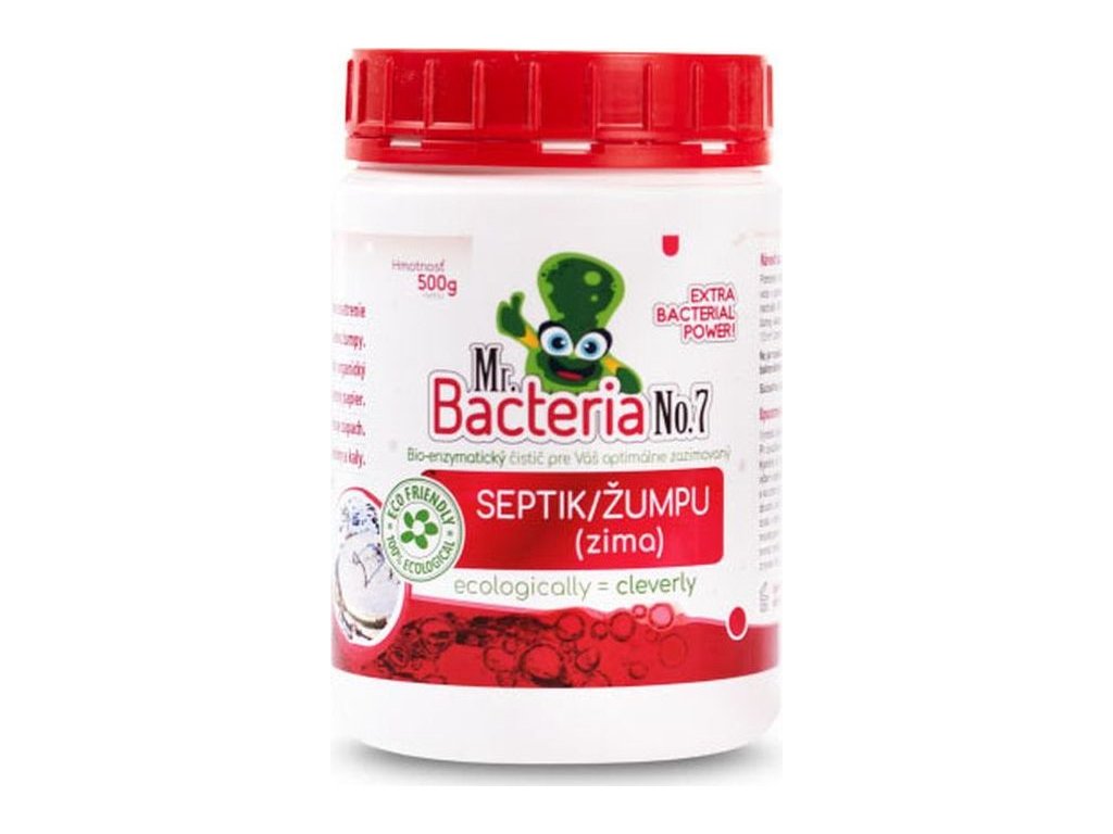 Mr. Bacteria No. 7 je přípravek určený k rozkladu organických nečistot, usazenin a kalů v žumpách a septicích. Působením bakterií a jimi tvořených enzymů dochází ke zkapalňování pevného organického odpadu, který se změní v nezapáchající kapalinu. Kapalinu lze později bez problémů čerpat, nedochází k ucpávání kanalizace ani případných trativodů. Pravidelným používáním tak odpadá nákladné vyvážení a čištění septiku nebo žumpy, protože dříve se tvořící kaly a usazeniny snižovaly využitelný obsah žumpy nebo septiku a vývoz tedy musel být mnohem častější. Veškerý organický odpad se rozkládá zejména na vodu a CO2. Přípravek Mr. Bacteria No. 7 se dávkuje jednorázově před zimou a udrží Váš septik/žumpu čistou po celou zimu. Přípravek je ideální na chaty, chalupy a místa, kde není možnost během zimy ošetřovat Váš septik/žumpu přípravkem Mr. Bacteria No. 1.