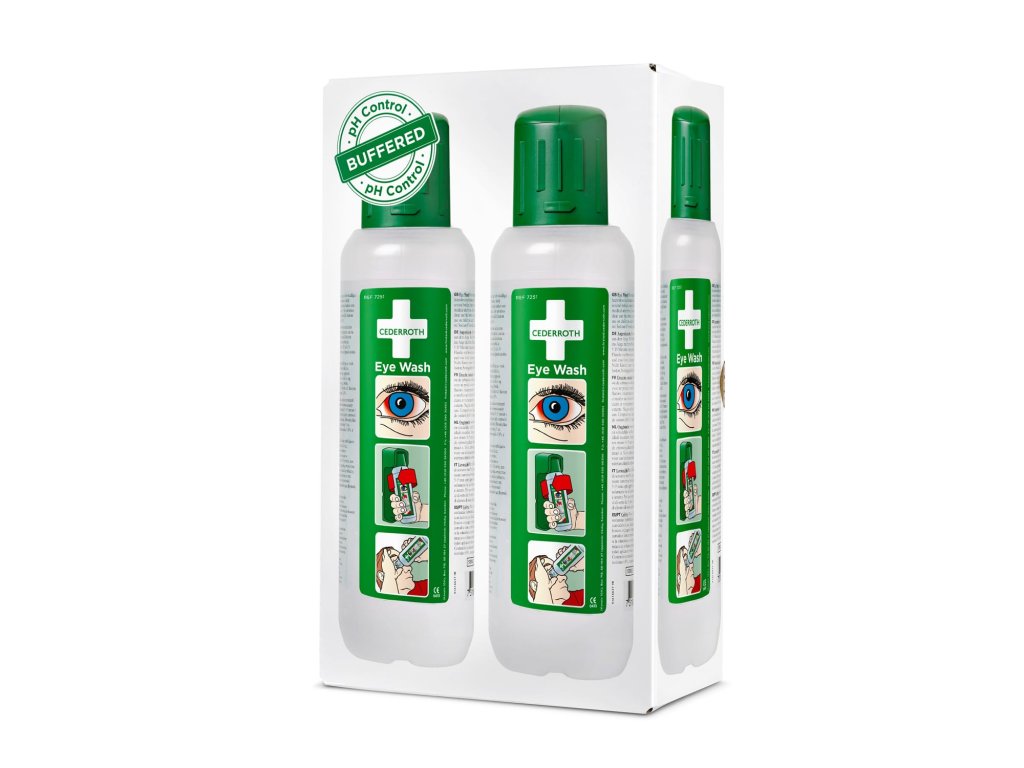 Lahvičky na výplach očí obsahující sterilní roztok borátového pufru. Cederroth Eye Flush Buffer je vhodný pro vyplachování cizích těles, kontaminantů (jako je prach, špína, kovové a dřevěné třísky atd.) a chemikálií, jako jsou zásady nebo kyseliny v situacích první pomoci. Roztok borátového pufru neutralizuje stříkající louhy a kyseliny a obnovuje přirozené neutrální pH oka. Jeho účinek je silnější u zásad než u kyselin. Je 100% bez fosfátů, takže pokud dojde k nehodě s materiály obsahujícími vápník (jako je cement, beton nebo vápno), použijte pufrovací roztok pro vyplachování očí s obsahem boritanu Cederroth. Dodává se ve snadno použitelné lahvičce s ergonomickým uzávěrem, protiprachovým krytem a jasným návodem k použití. Láhev lze snadno otevřít odšroubováním prachového uzávěru a je připravena k použití. Vestavěná speciální očnice pomáhá udržet oko otevřené během vyplachování a zajišťuje velkorysý průtok bez zbytečného plýtvání. Vhodné pro samostatné použití nebo pro nabíjení nástěnných stanic. Záruční doba: 4,5 roku. Doba oplachování: asi 5 minut.