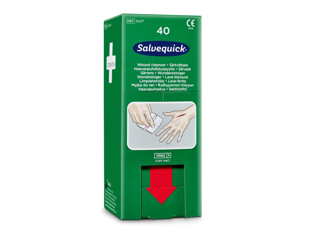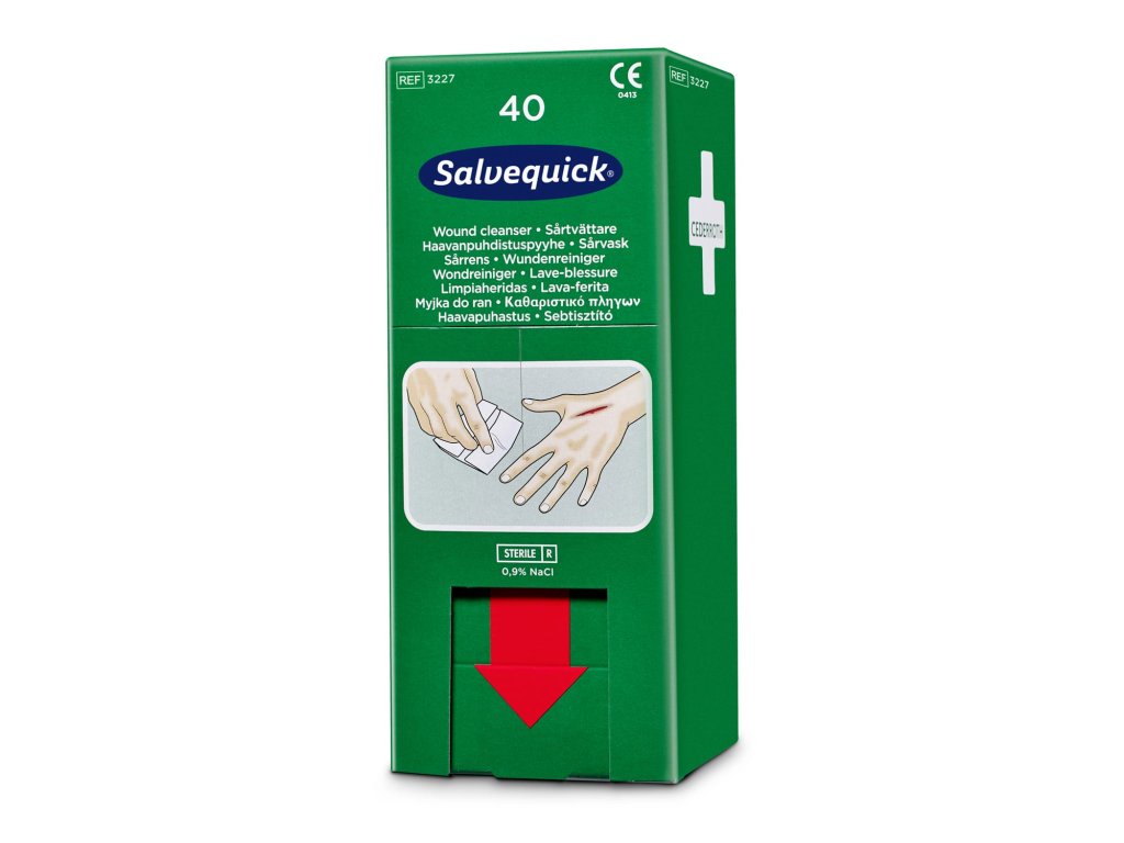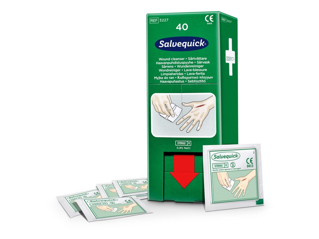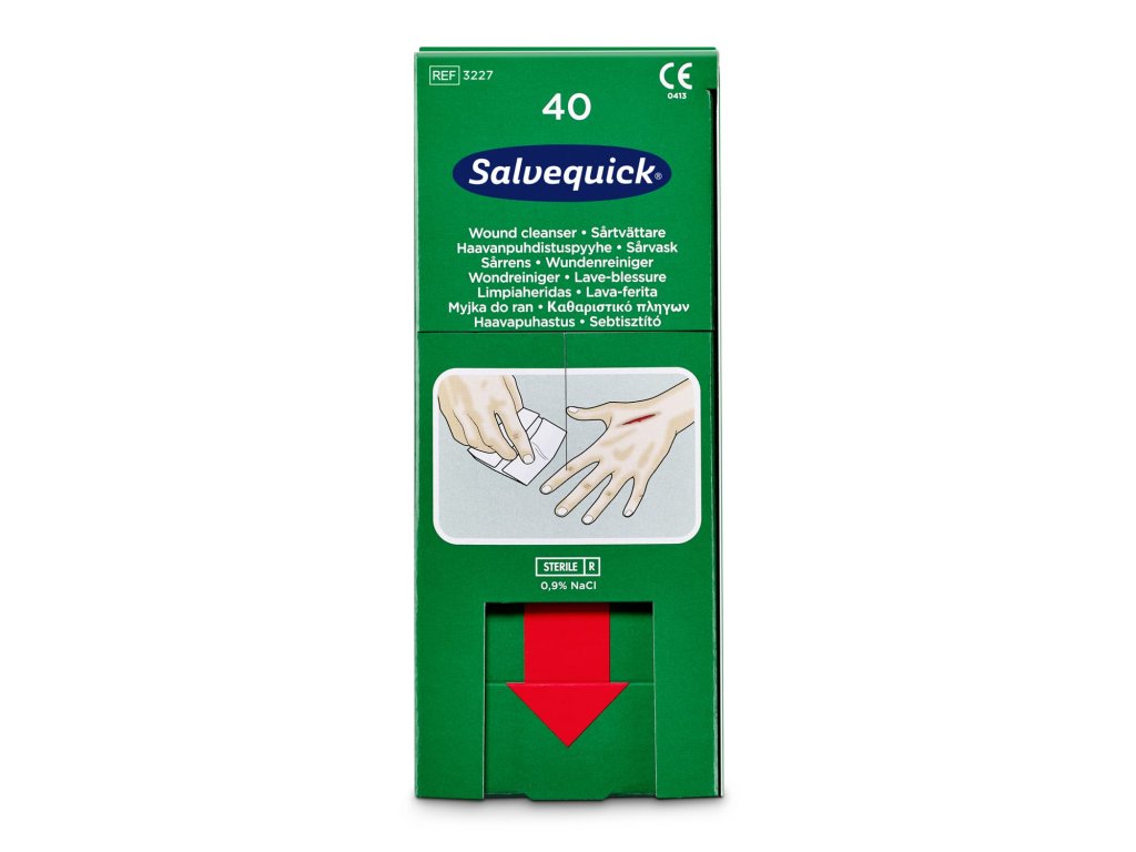 Krabička obsahuje 40 jednotlivě balených ubrousků vhodných k čištění ran způsobených škrábanci a řezy. Díky utěrce na čištění ran Salvequick není potřeba vaty a dezinfekčních lahviček. Namočené ve sterilním fyziologickém roztoku, jednotlivě balené. Vhodné také pro doplňování zásobníků obvazů Cederroth. Rozměr utěrek je 100 x 140 mm. Zdravotnický prostředek třídy IIa.