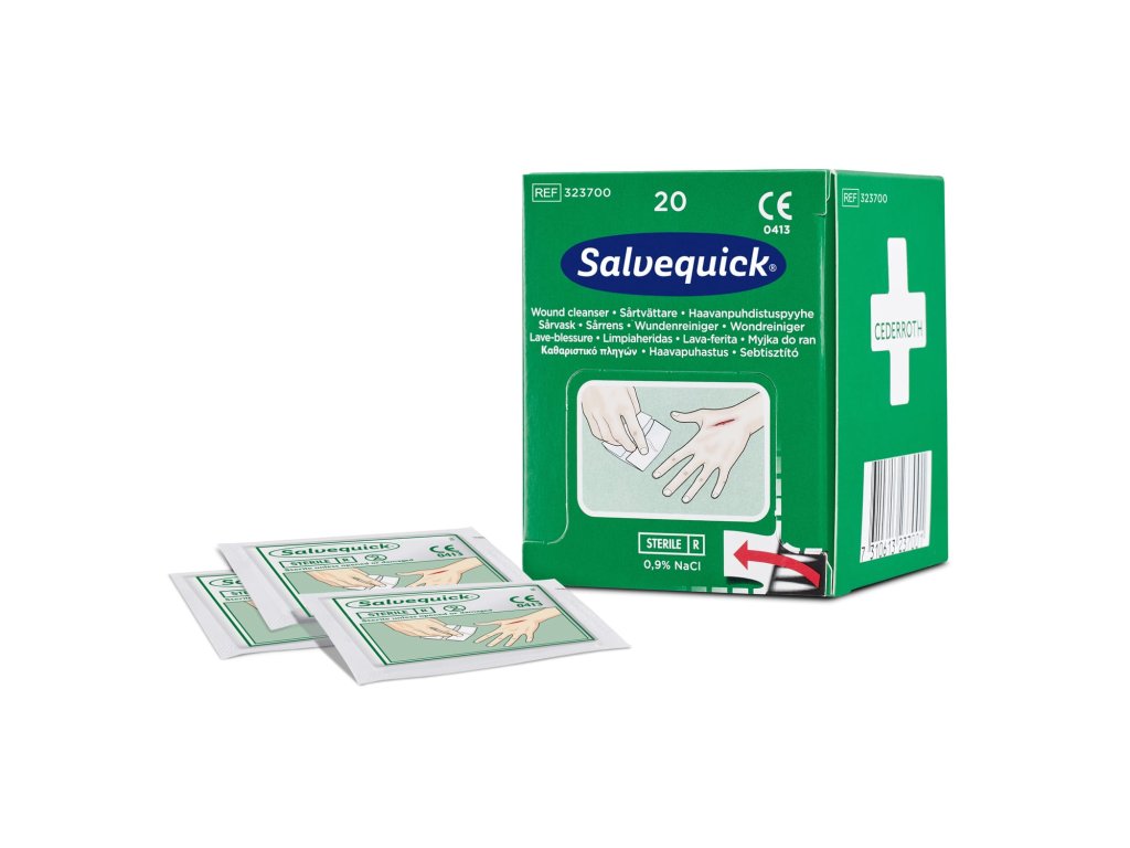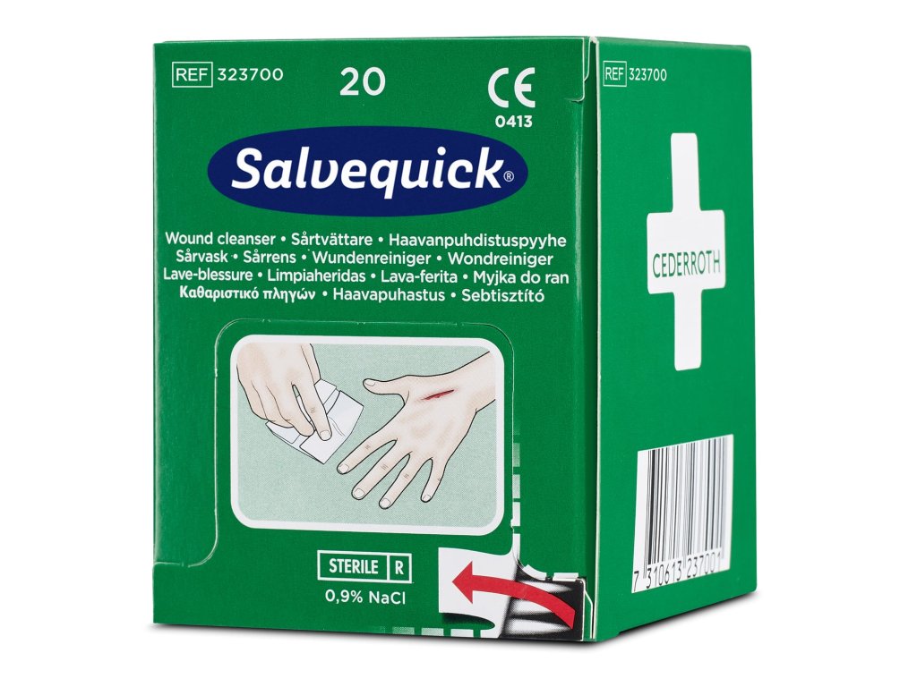 Krabička obsahuje 20 jednotlivě balených ubrousků vhodných k čištění ran způsobených škrábanci a řezy. Díky utěrce na čištění ran Salvequick není potřeba vaty a dezinfekčních lahviček. Namočené ve sterilním fyziologickém roztoku, jednotlivě balené. Vhodné také pro doplňování stanic první pomoci Cederroth. Rozměr utěrek je 100 x 140 mm. Zdravotnický prostředek třídy IIa.