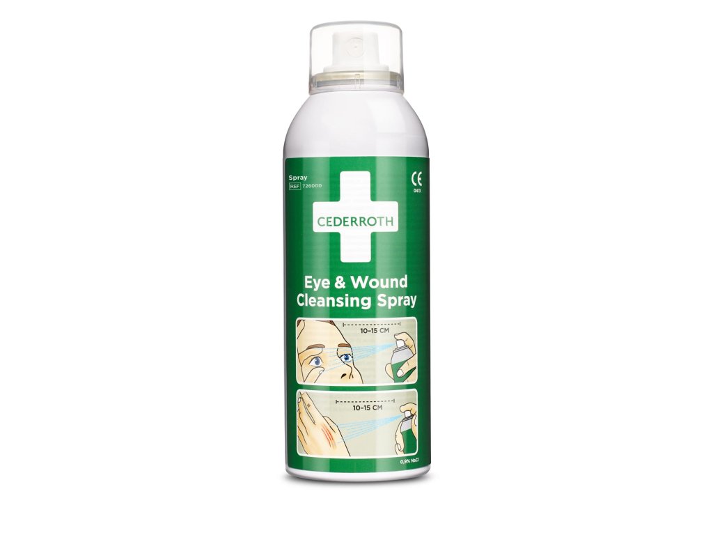 Aerosol pro čištění ran a výplach očí se sterilním 0,9% roztokem chloridu sodného. Umožňuje okamžitou a účinnou první pomoc při drobných nehodách (jako jsou drobné škrábance, řezné rány, prach a nečistoty v očích). Pomáhá minimalizovat riziko další infekce nebo poškození. Snadno použitelný přenosný sprej bez konzervačních látek. Obsahuje sterilní fyziologický roztok, jeho použití je bezbolestné a lze jej používat opakovaně. Poskytuje rovnoměrné splachování při použití v jakémkoli úhlu. 0,9% sterilní fyziologický roztok je dostatečně silný na to, aby očistil rány od cizích materiálů a nečistot, ale zároveň je dostatečně šetrný – díky tomu je vhodný k výplachům očí. Záruční doba 5 let. Doba oplachování: cca. 5 minut.