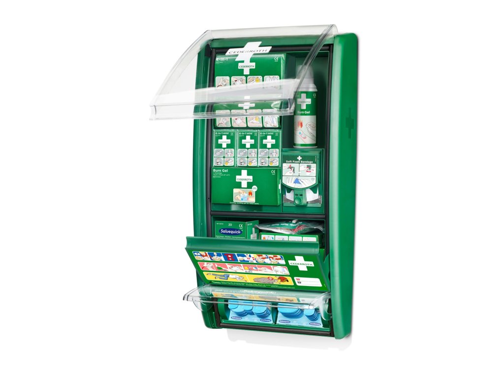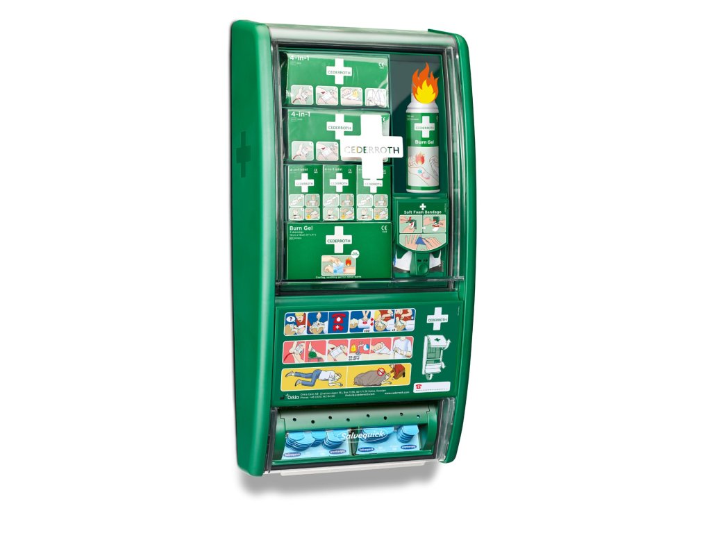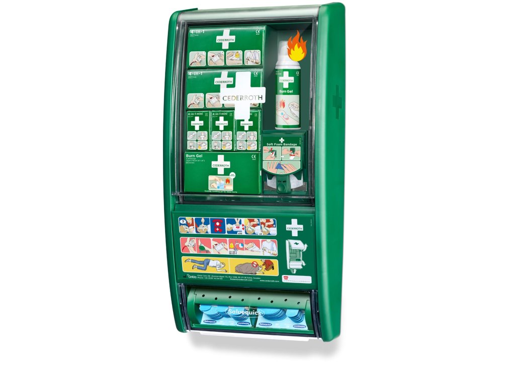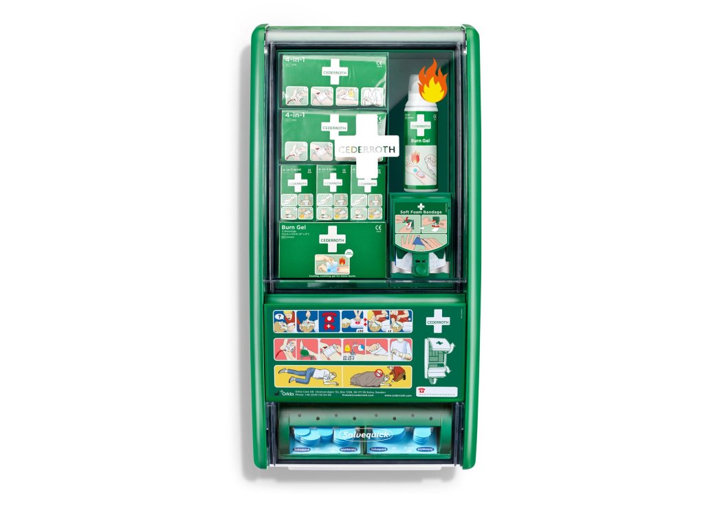 Plně vybavená stanice první pomoci pro pracoviště s nebezpečím popálení.
