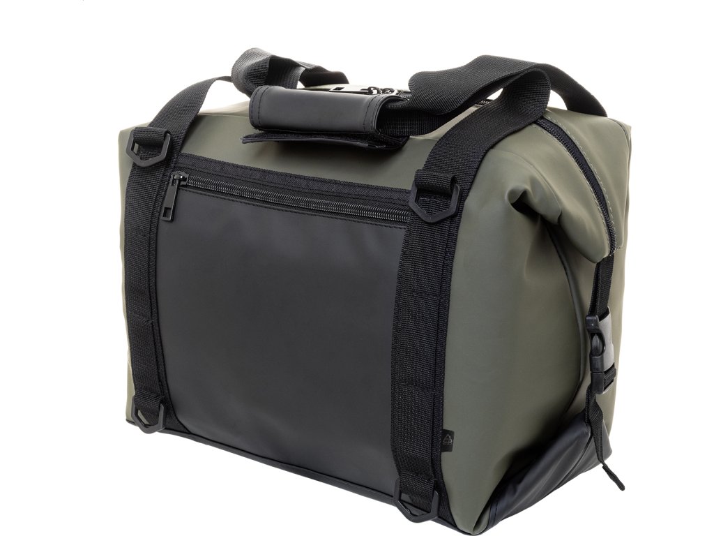 Skládací chladící taška na zip z měkké recyklované PU kůže s hliníkovou výplní a přední kapsou na zip. S bočními přezkami, držadly a nastavitelným ramenním popruhem. Tašku lze složit naplocho pro snadné skladování nebo ji během používání zajistit pomocí bočních výztuh.