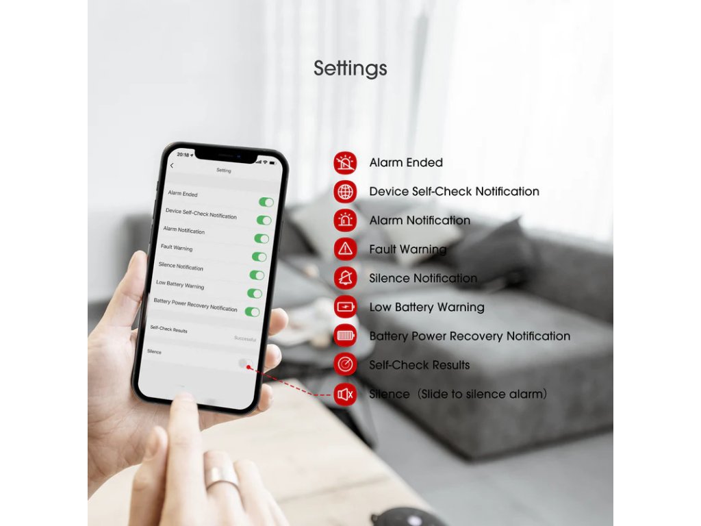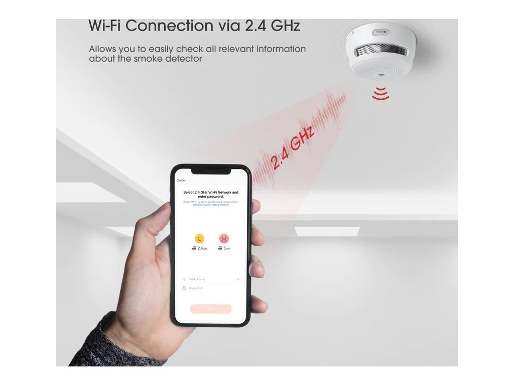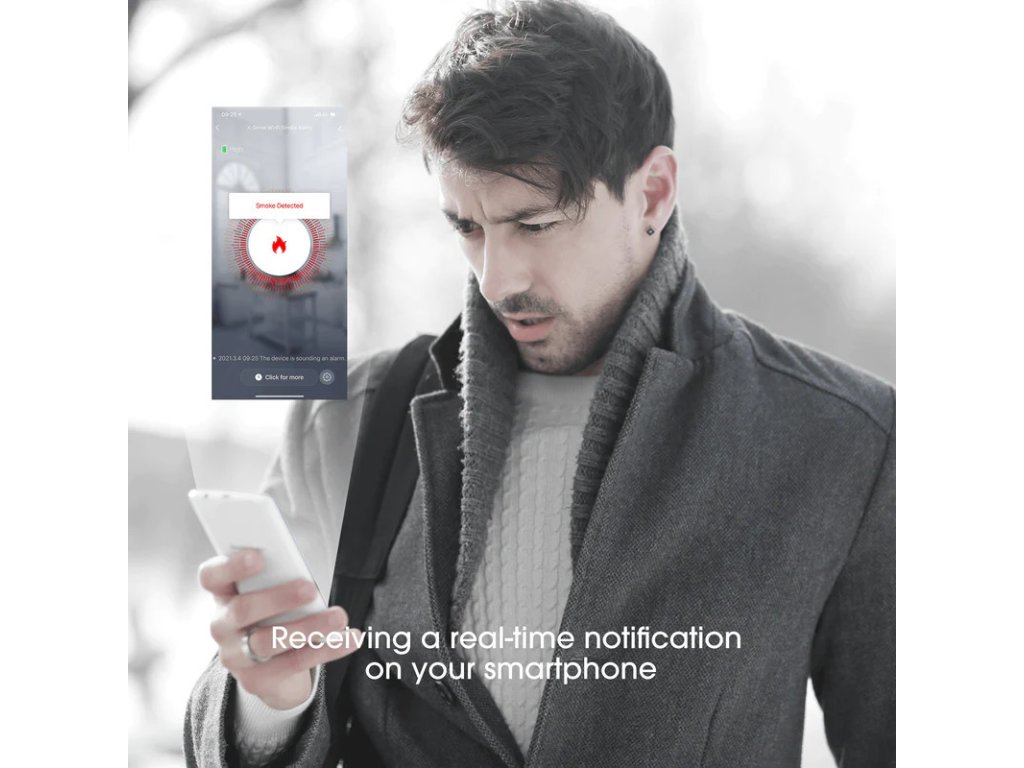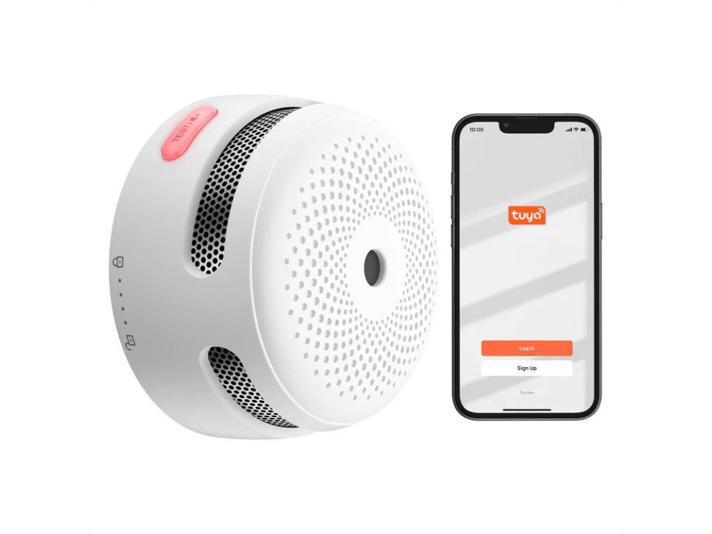Wi-Fi kouřový hlásič s vyměnitelnou lithiovou baterií a testovacím/ztišovacím tlačítkem, inteligentní požární hlásič, funkce automatické kontroly. Hlásič je zařízením autonomní detekce a signalizace podle ČSN EN 14604 a odpovídá také standardu UL 217.