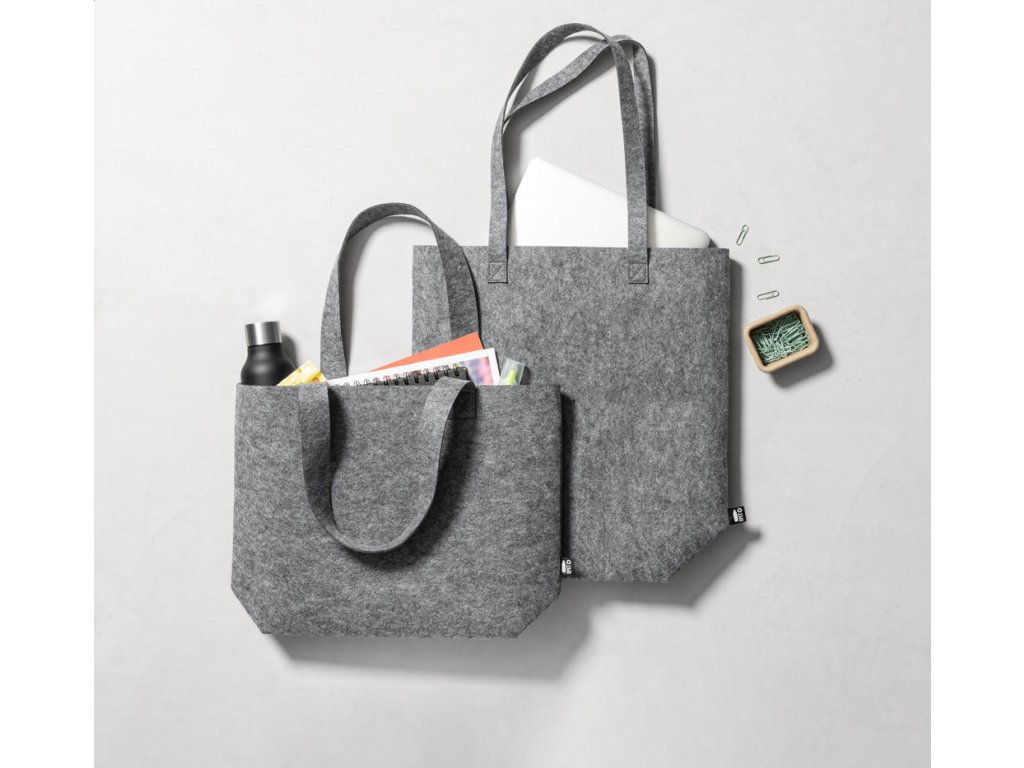 Nákupní taška z RPET plsti s dlouhými uchy a rozšířeným dnem. S výrazným štítkem RPET.