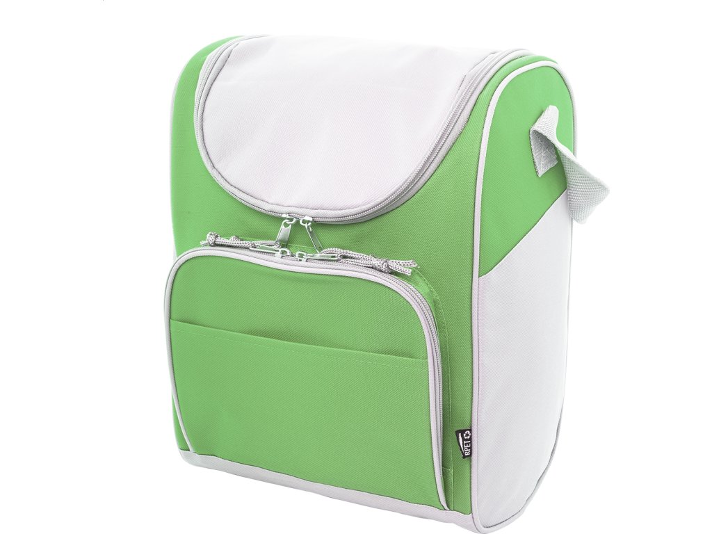 Chladicí taška RPET s hliníkovým polstrováním. Se 2 přihrádkami na zip, malou přední kapsou a nastavitelným ramenním popruhem. 600D RPET polyester s výrazným štítkem RPET.