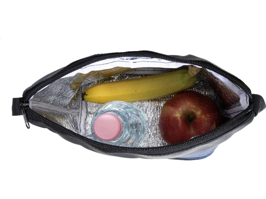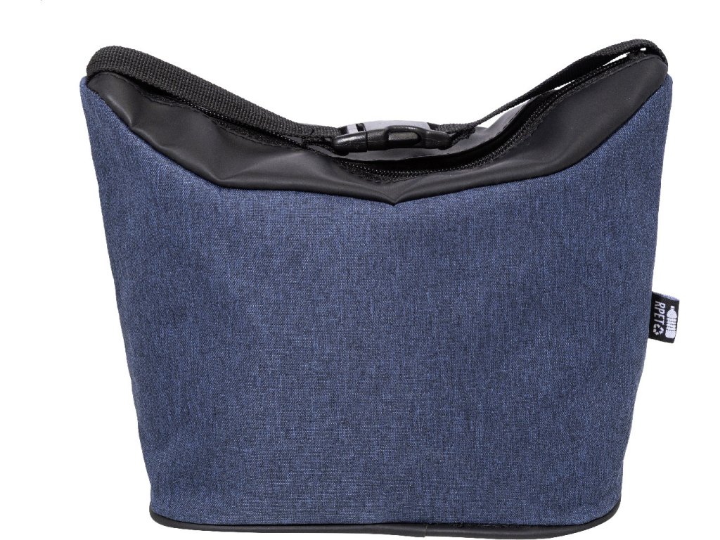 Chladicí taška na zip z polyesteru 600D RPET s detaily z měkké recyklované PU kůže, hliníkovým polstrováním a popruhem na přezku. S výrazným štítkem RPET.