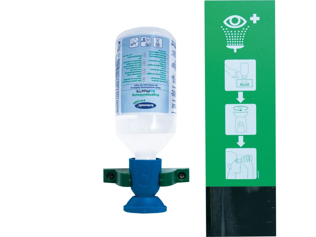 Stanice na vyplachování očí s jednou lahvičkou a držákem na stěnu. Sterilní lahvička připravená k použití s ergonomickou oplachovací hlavou a protiprachovým uzávěrem. Piktogramový návod se zrcátkem pro snadnou manipulaci. Se šrouby pro montáž + havarijní plán havarijního oka. 500 ml BioPhos®74 fosfátového pufrového oplachovacího roztoku. Doba oplachování: cca. 5 minut. Doba použitelnosti: 3 roky.