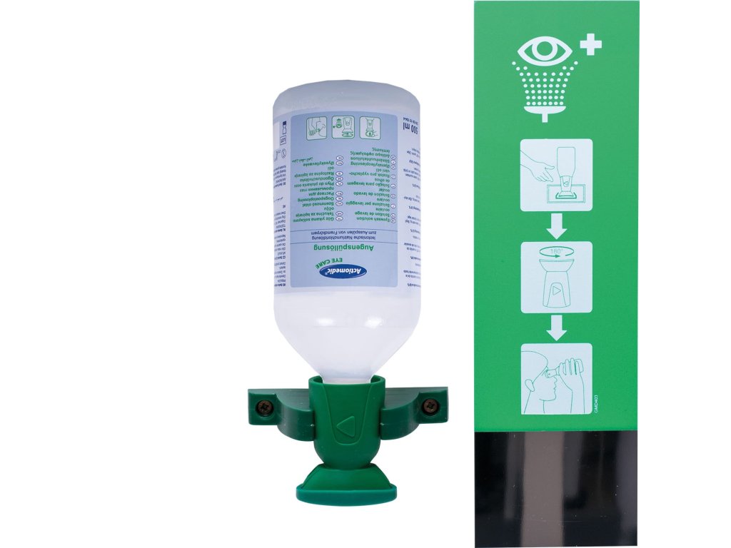 Stanice na vyplachování očí s jednou lahvičkou a držákem na stěnu. Sterilní lahvička připravená k použití s ergonomickou oplachovací hlavou a protiprachovým uzávěrem. Piktogramový návod se zrcátkem pro snadnou manipulaci. Se šrouby pro montáž + havarijní plán havarijního oka. 1 x 500 ml roztoku chloridu sodného. Doba oplachování: cca. 5 minut. Doba použitelnosti: 3 roky.