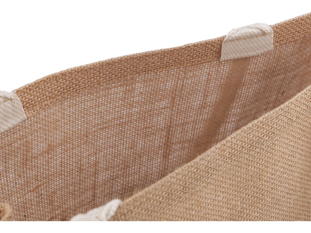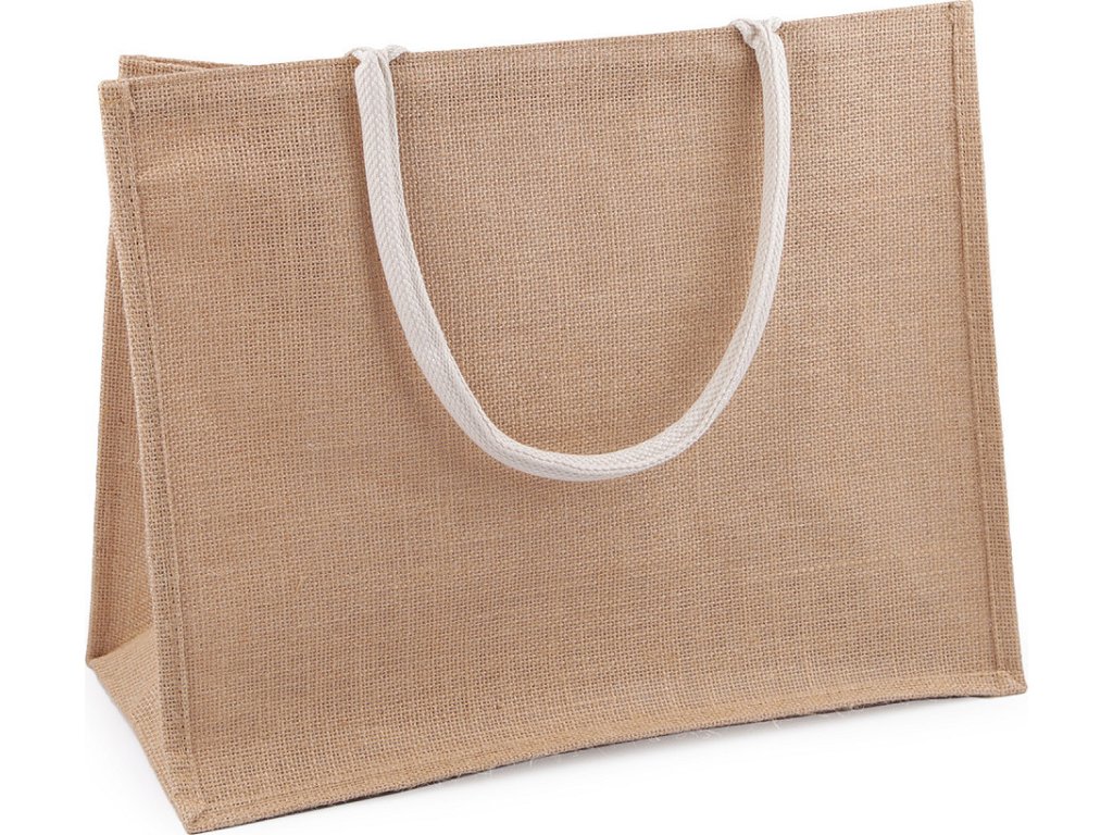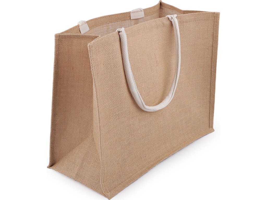 Jutová taška je velice prostorná s rozšířeným dnem. Taška je bez zapínání. Kromě její vysoké pevnosti oceníte i vnitřní pogumování, které se dá dobře čistit. Dá se nosit i jako taška na pláž, je vhodná na mokré plavky. Ucha jsou určená k nošení v ruce. Juta je velice silný a odolný materiál. Můžete si ji dozdobit podle vlastní fantazie a vtisknout jí tak jedinečnou tvář. Je vhodná k malování barvami na textil, potisku, lze na ni vyšívat.