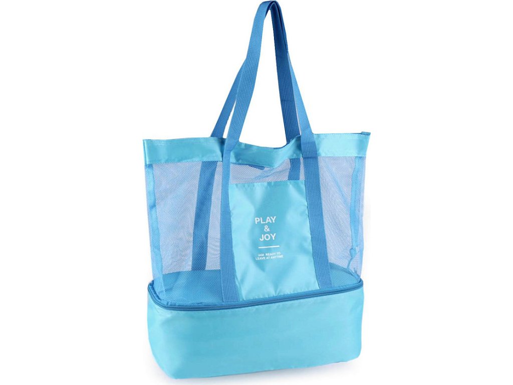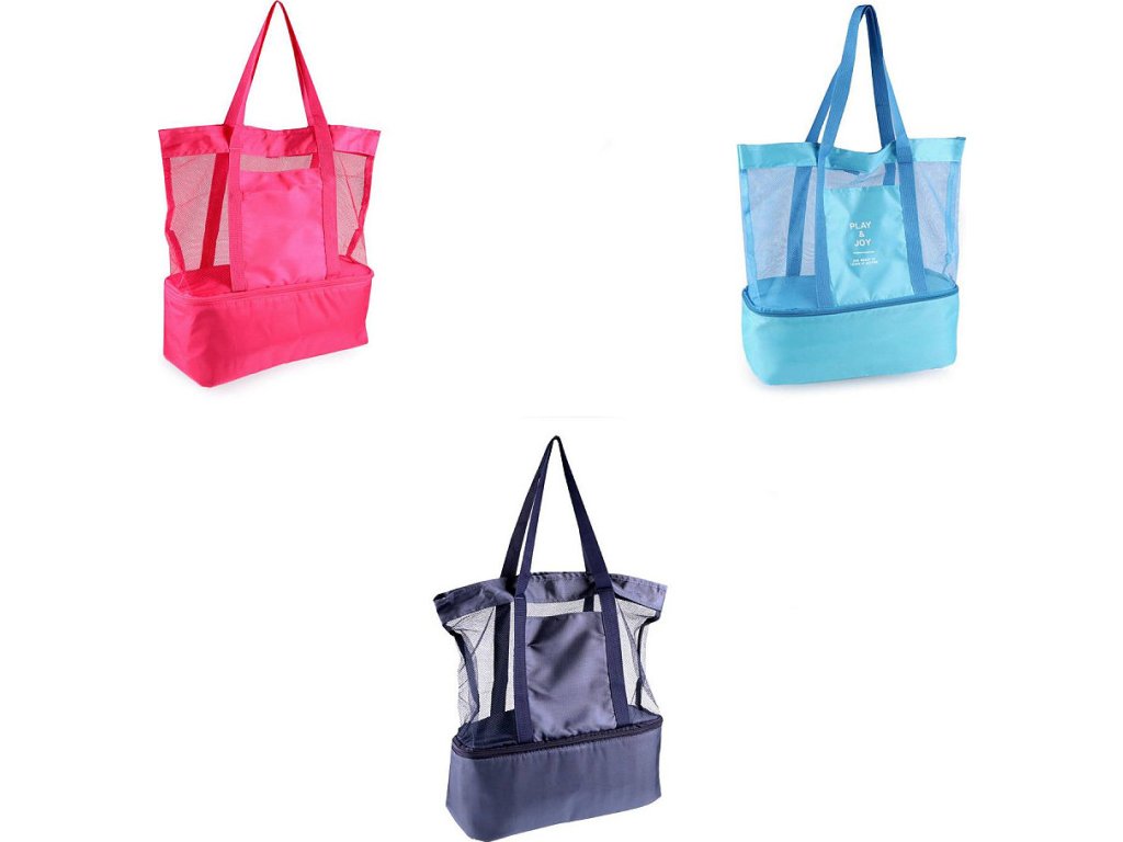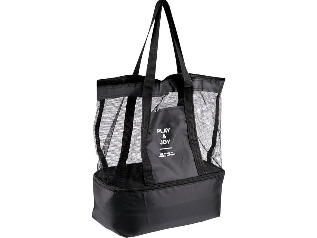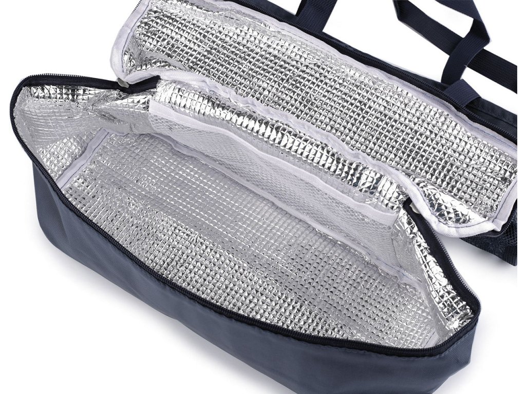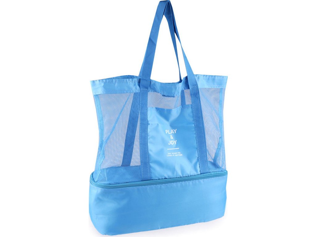 Velká síťovaná taška je lehká a prostorná, s rozšířeným dnem, ve kterém je navíc schovaný termobox. Taška má magnetické zapínání, dá se nosit i na pláž. Na přední straně má kapsu na uložení drobností, další malou kapsu najdete i uvnitř termoboxu. Ucha jsou určená k nošení v ruce. Termobox ve spodní části se uzavírá na zip. Uchovává potraviny po určitou dobu při stejné teplotě. Má izolační vrstvu, která je omyvatelná. Rozměry termoboxu (ŠxVxH) jsou 38 x 14 x 14 cm.
