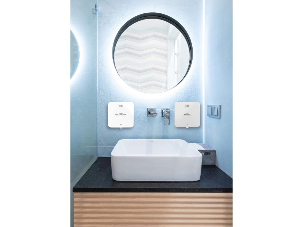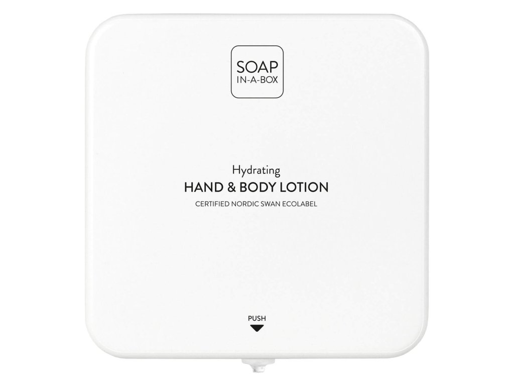 Koncept dávkovače Soap-In-A-Box kombinuje eleganci a efektivitu, přičemž je šetrný k pokožce a životnímu prostředí. Dávkovač je dodáván s 450 ml vzduchotěsným doplňovacím sáčkem s pevnou dávkou 2 ml, což umožňuje průměrně 225 použití.