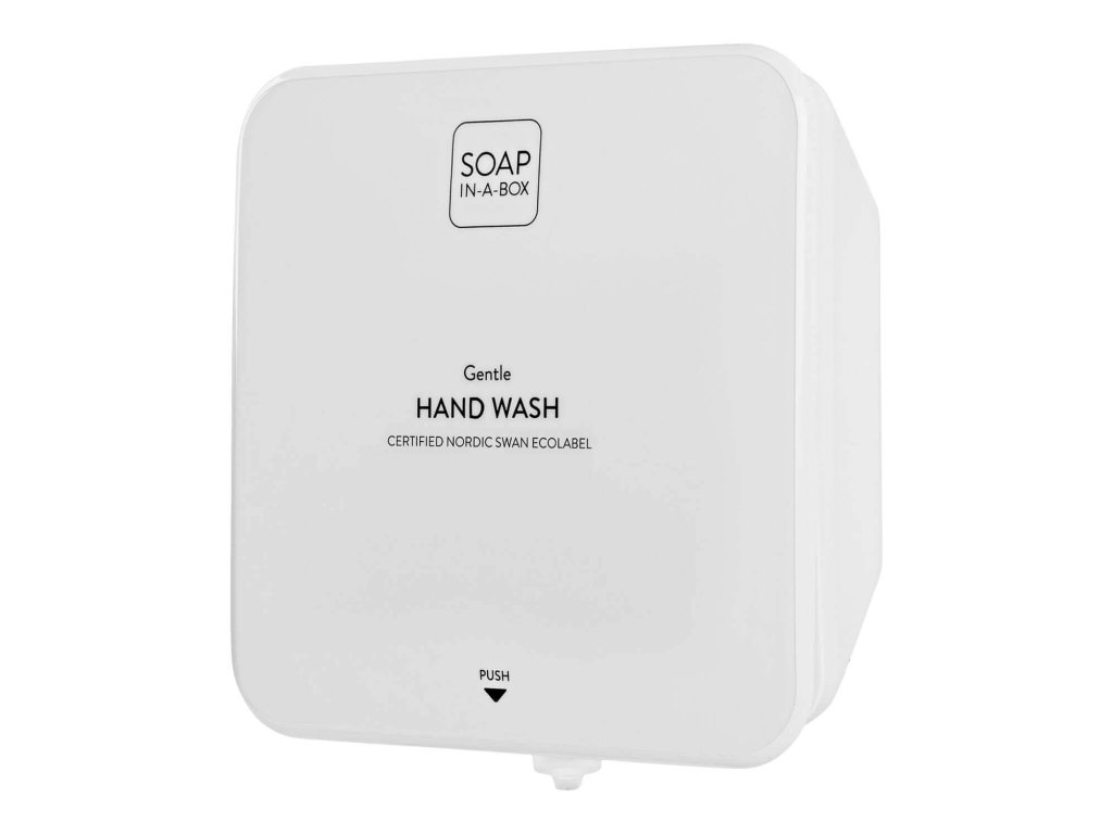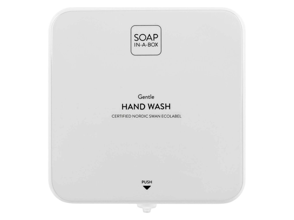 Koncept dávkovače Soap-In-A-Box kombinuje eleganci a efektivitu, přičemž je šetrný k pokožce a životnímu prostředí. Dávkovač je dodáván s 450 ml vzduchotěsným doplňovacím sáčkem s pevnou dávkou 2 ml, což umožňuje průměrně 225 umytí rukou.