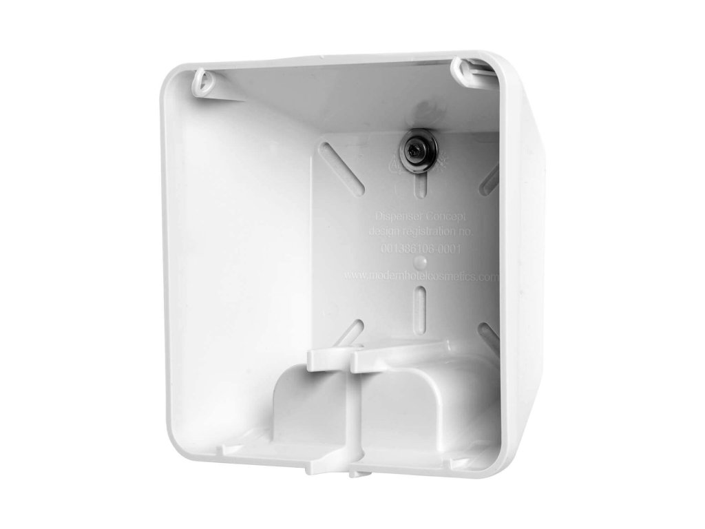 Lesklý bílý dávkovač mýdla pro náhradní náplň Eqderma 450 ml. Dávkovač se skládá z 1 předního a 1 zadního panelu.