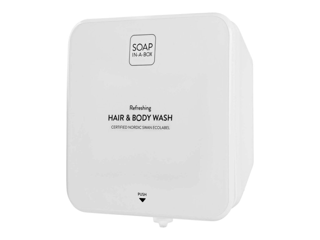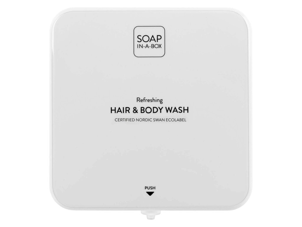 Koncept dávkovače Soap-In-A-Box kombinuje eleganci a efektivitu, přičemž je šetrný k pokožce a životnímu prostředí. Dávkovač je dodáván s 450 ml vzduchotěsným doplňovacím sáčkem s pevnou dávkou 2 ml, což umožňuje průměrně 225 použití.