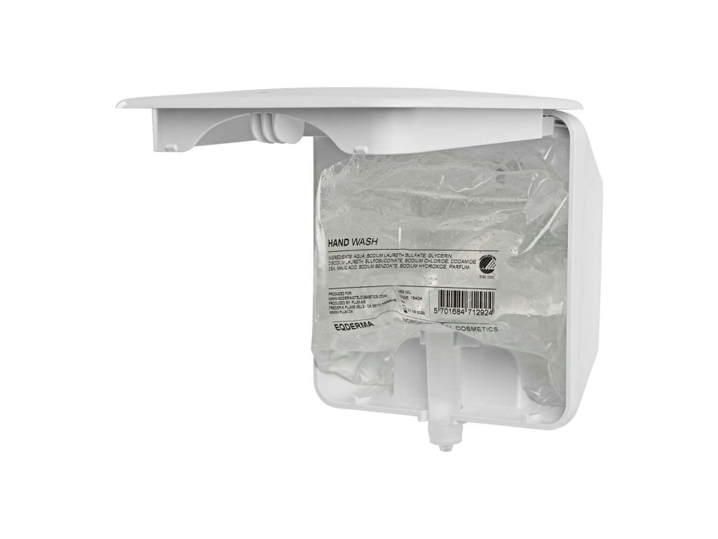 Lesklý bílý dávkovač sprchového gelu a šamponu pro náhradní náplň Eqderma 450 ml. Dávkovač se skládá z 1 předního a 1 zadního panelu.