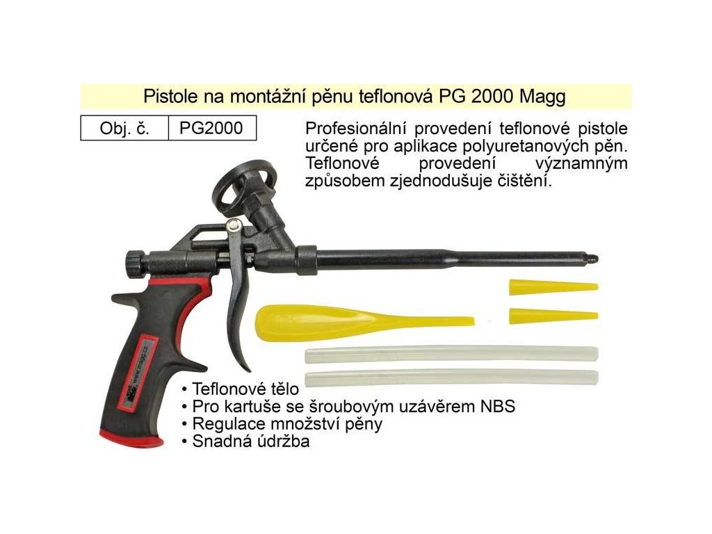 Pistole na montážní pěnu PG2000 MAGG je profesionální provedení teflonové pistole určené pro aplikace polyuretanových pěn. Teflonové provedení významným způsobem snižuje nároky na čištění pistole po použití.