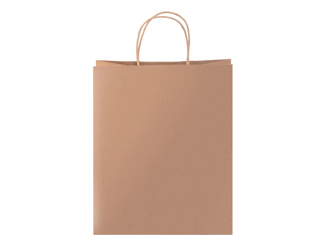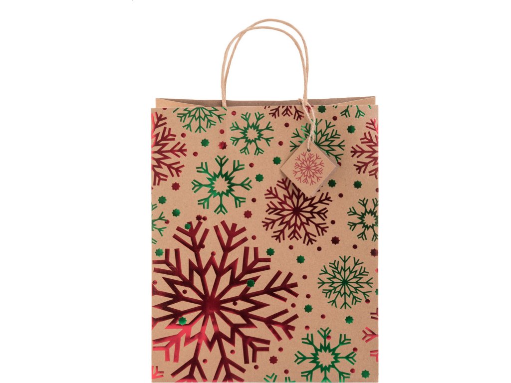 Dárková taška z recyklovaného kraftového papíru s vánočním designem vyraženým fólií, kroucenými uchy a dárkovou visačkou. 140 g/m².