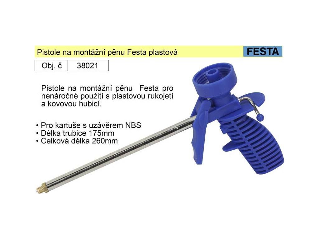 Pistole na montážní pěnu Festa pro nenáročné použití s plastovou rukojetí a kovovou hubicí.