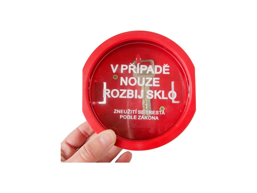Plastová skříňka s rozbitným sklem pro uložení klíče k požárním prostředkům.