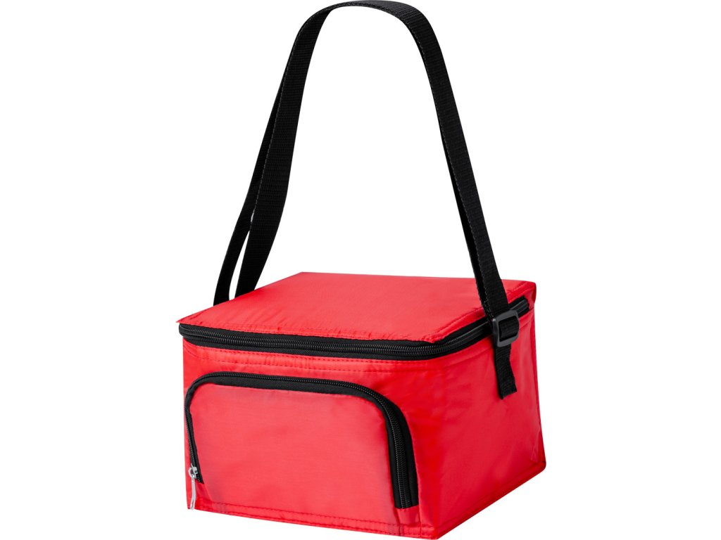 Polyesterová chladicí taška s přihrádkami na zip, hliníkovým polstrováním a ramenním popruhem. Pro 6 ks plechovek 0,33L. 210D polyester.