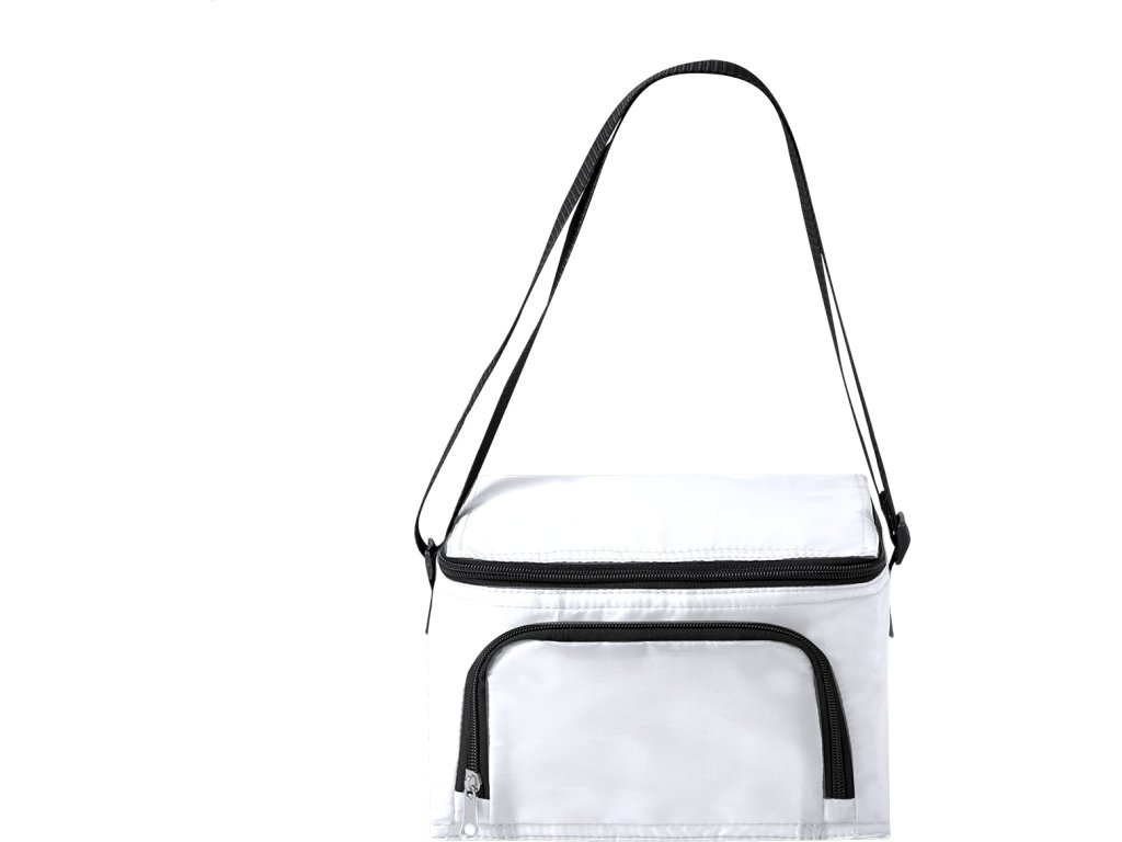 Polyesterová chladicí taška s přihrádkami na zip, hliníkovým polstrováním a ramenním popruhem. Pro 6 ks plechovek 0,33L. 210D polyester.