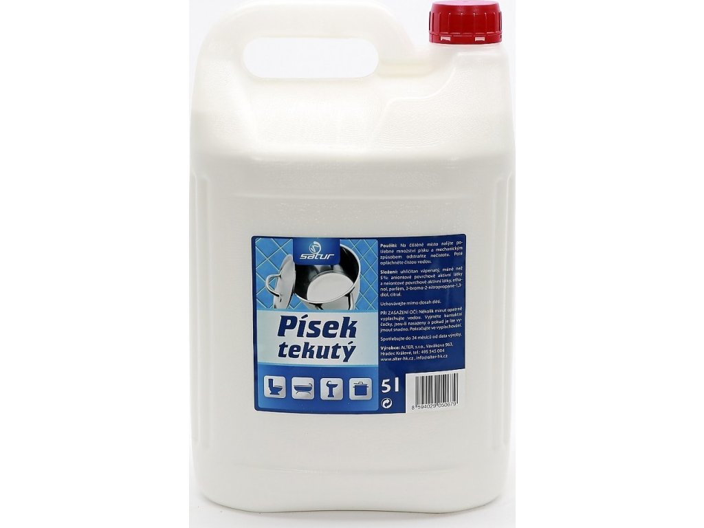 SATUR PÍSEK TEKUTÝ je krémový abrazivní čisticí prostředek vhodný na čištění umyvadel, van, nádobí, obkladů a WC. Přípravek je parfemován jemnou citronovou vůní.