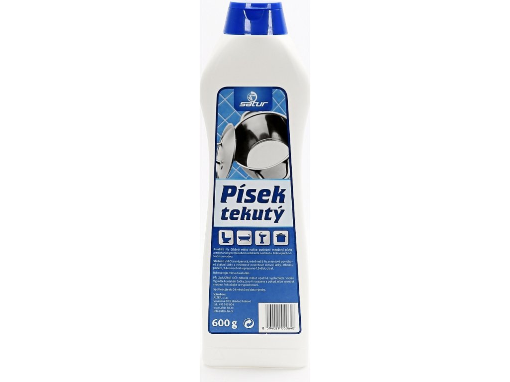 SATUR PÍSEK TEKUTÝ je krémový abrazivní čisticí prostředek vhodný na čištění umyvadel, van, nádobí, obkladů a WC. Přípravek je parfemován jemnou citronovou vůní.