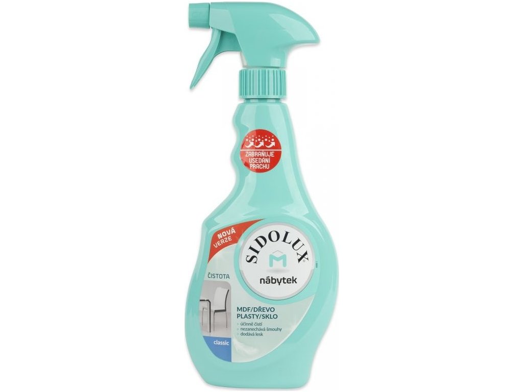 Sidolux M na nábytek je speciální sprej vhodný na většinu povrchů, které se doma nachází. Produkt Anti Dust je možné použít na dřevo, mdf, plast, lakované povrchy a nerez i sklo. Prostředek velmi příjemně voní a jeho použití je velmi jednoduché díky nádobce, která pasuje přesně do ruky. Prostředek Sidolux M je vhodný na běžné denní čištění všech výše uvedených ploch od nečistot, mastnoty a prachu. Díky nové formuli také zaceluje póry materiálů a zabraňuje tak usazování prachu. Prostředek má velmi příjemnou vůni a provoní tak celý byt.