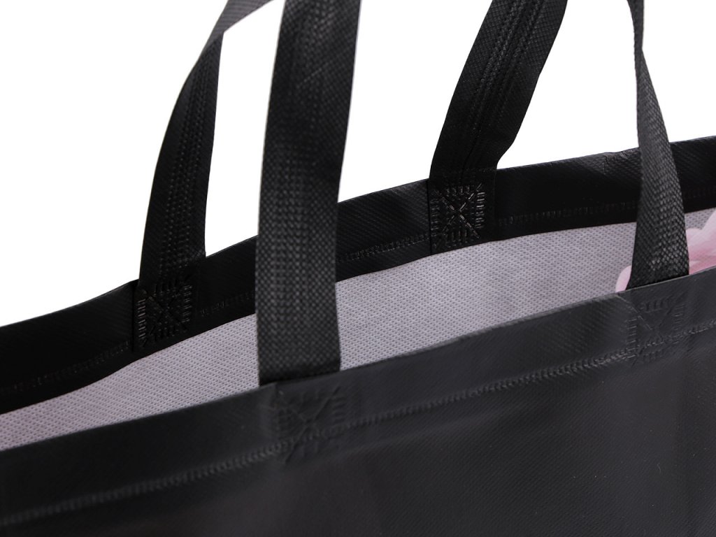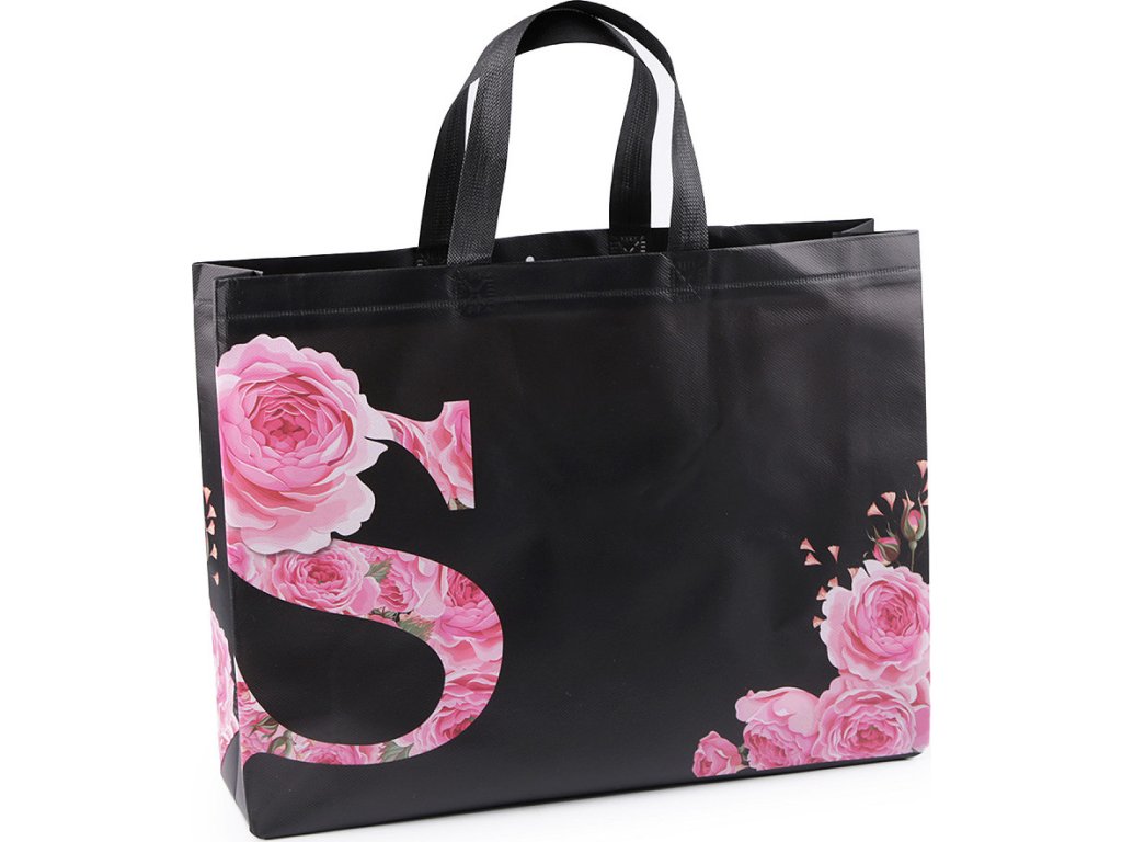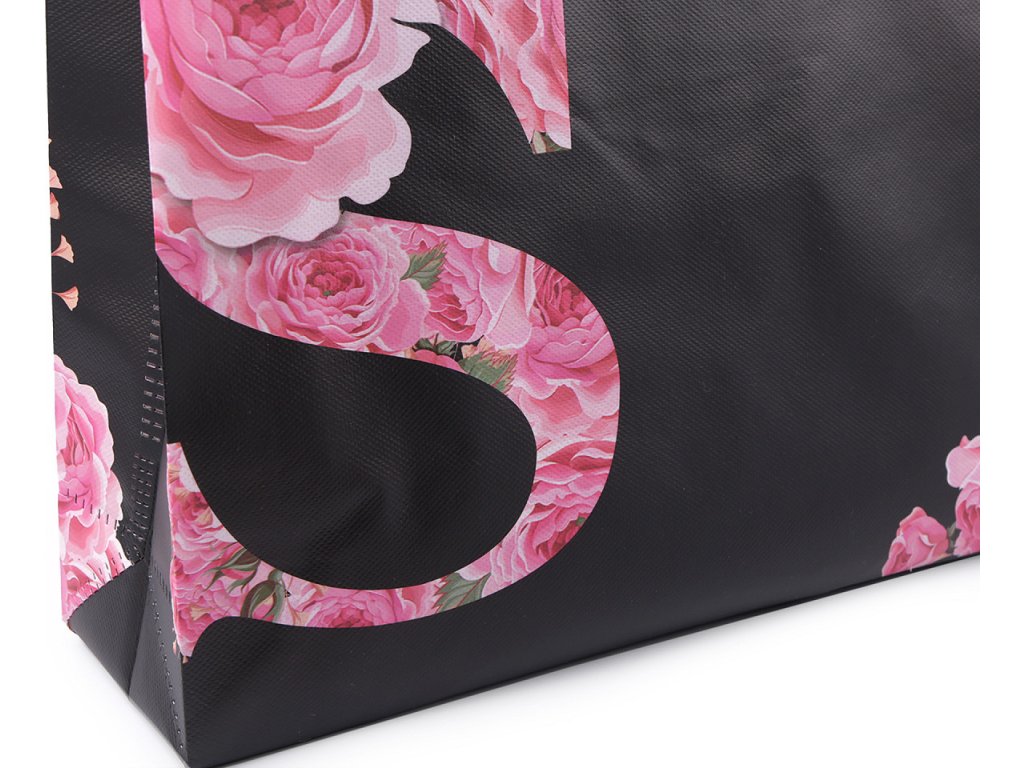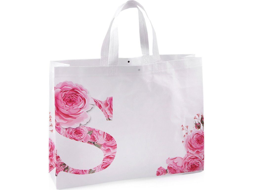 Do velké tašky z laminované netkané textilie s potiskem růží naskládáte plno věcí. Má dvě ucha, skvěle se složí třeba do kabelky. Díky opakovanému používání je šetrná k životnímu prostředí, stále častěji nahrazuje igelitové tašky. Hodí se k reklamním účelům. Není určená na těžké nákupy.