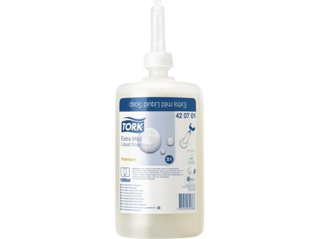Tekuté neparfémované mýdlo Tork,1litr=1000 dávek, jednorázová láhev včetně dávkovací pumpičky, dermatologicky testované složení bez obsahu parfémů a barviv, šetrné k pokožce. 6ks/krt