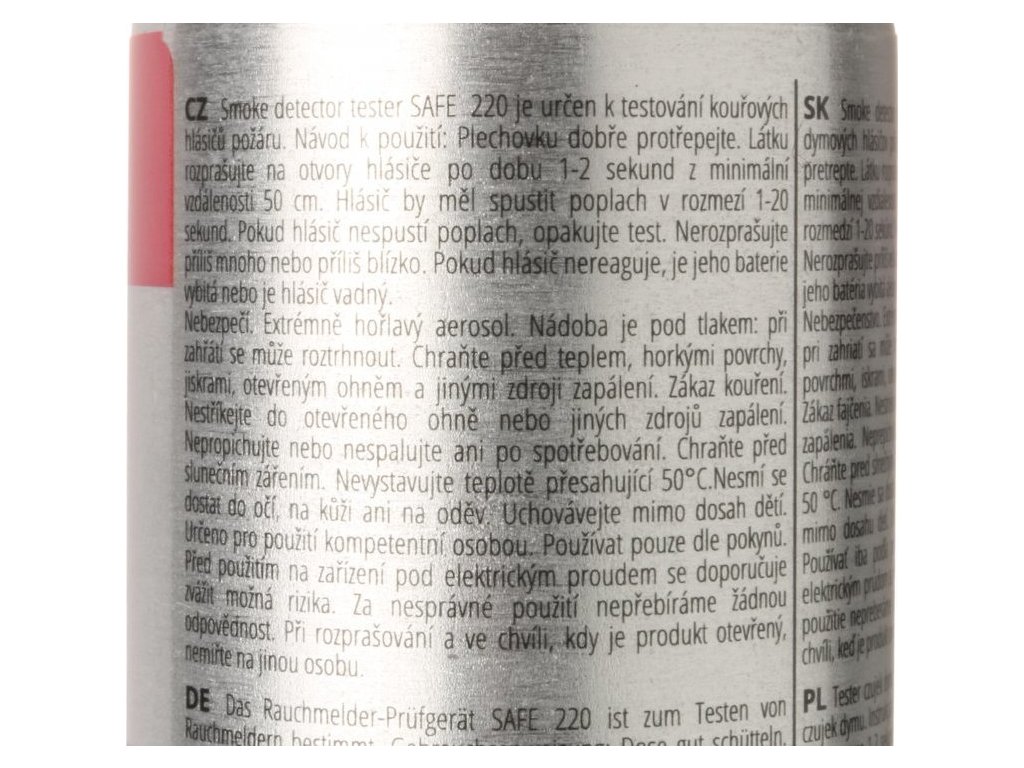 S testovacím sprejem SAFE 220 ověříte na místě instalace hlásiče, zda jeho obvody a systémy spolehlivě pracují a zda aktivně vyhledávají jakýkoliv náznak požáru. Pomocí velmi jednoduchého testu můžete ověřit provozuschopnost senzorů všech modelů optických i ionizačních kouřových hlásičů požáru, dle norem ČSN / EN 14604.