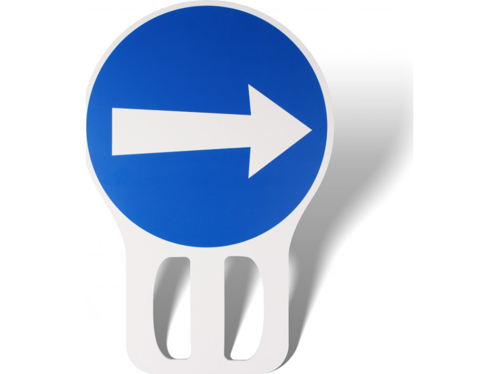 Zastavovací značka - terč do ruky STOP a PŘIKÁZANÝ SMĚR VPRAVO, je určen pro pracovníky, kterí organizují dopravu při výlukách, omezeních jízdního pruhuu a stavebních pracích na vozovce. Je viditelná na velkou vzdálenost a usnadňuje tak bezpečně zastavit vozidla, nebo umožniz objetí překážky silničního provozu.