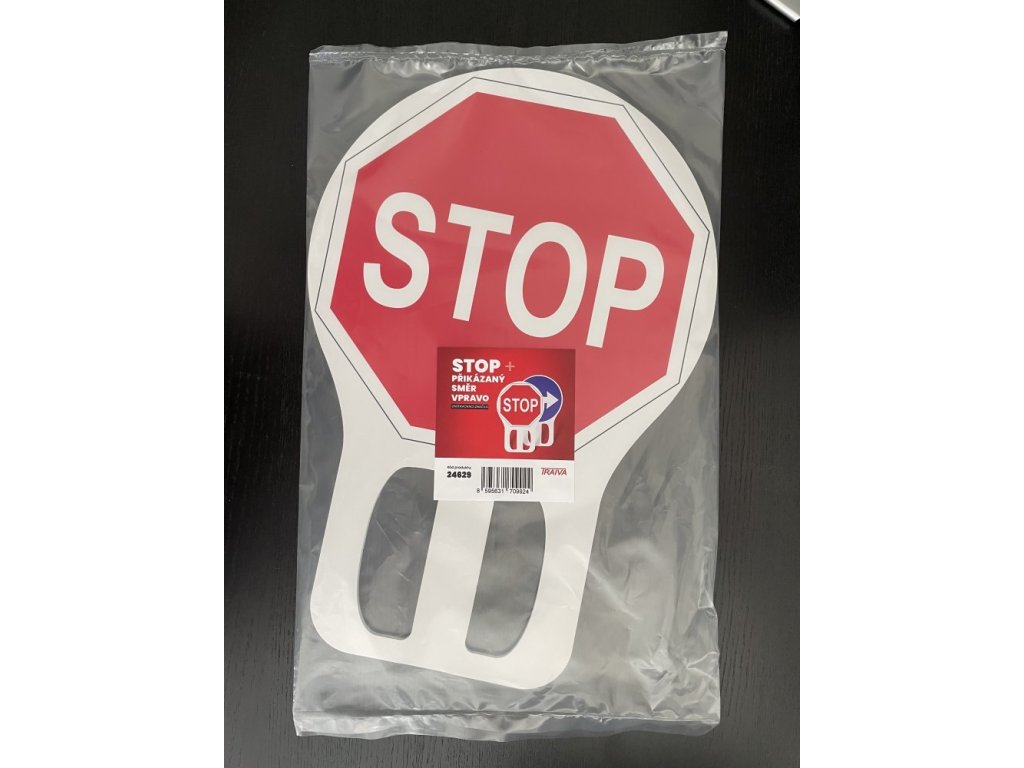 Zastavovací značka - terč do ruky STOP a PŘIKÁZANÝ SMĚR VPRAVO, je určen pro pracovníky, kterí organizují dopravu při výlukách, omezeních jízdního pruhu a stavebních pracích na vozovce. Je viditelná na velkou vzdálenost a usnadňuje tak bezpečně zastavit vozidla, nebo umožnit objetí překážky silničního provozu.
